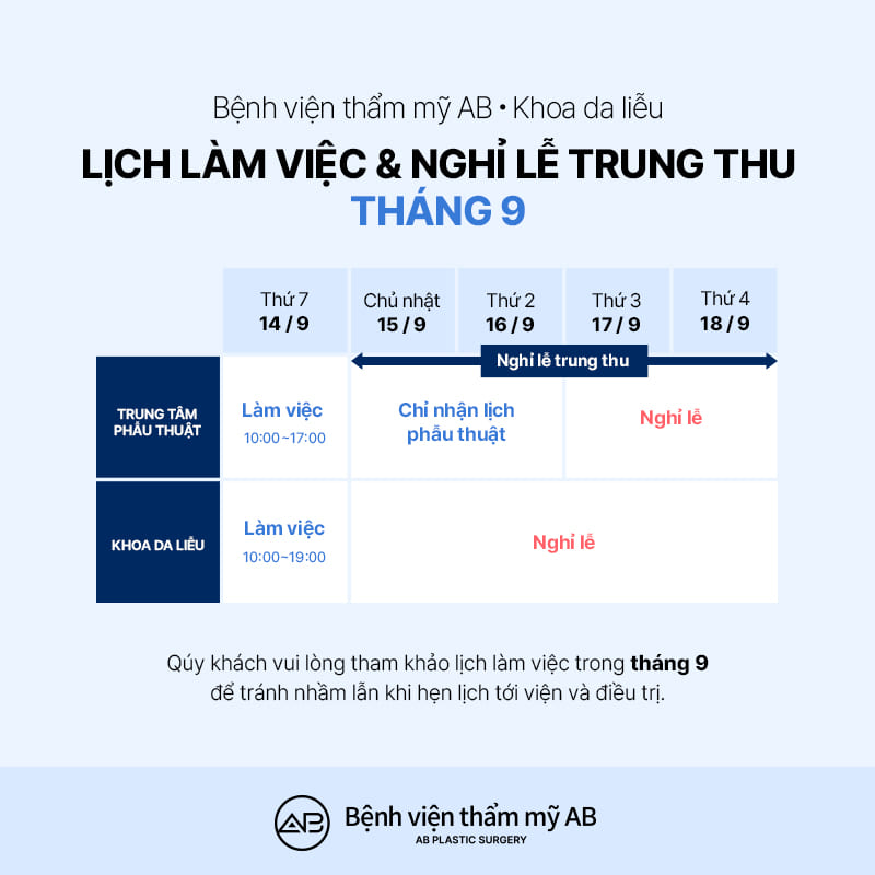 Bệnh viện thẩm mỹ AB xin trân trọng thông báo lịch làm việc và nghỉ lễ Trung Thu tháng 9 năm 2024 như sau: