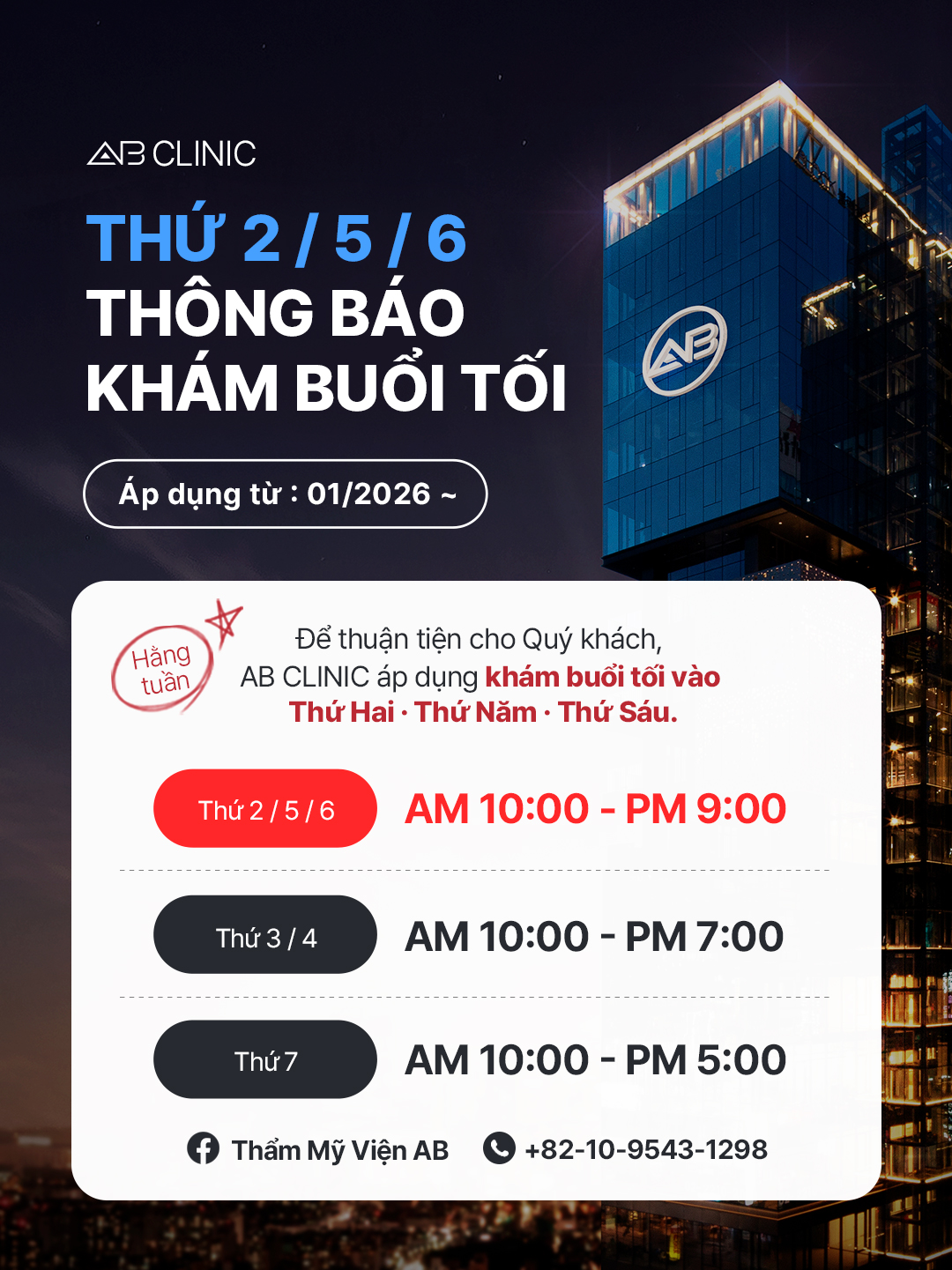 Bắt đầu từ tháng 1 năm 2026, Khoa Da liễu AB sẽ áp dụng lịch khám mới như sau: