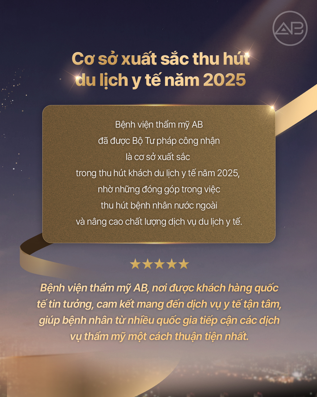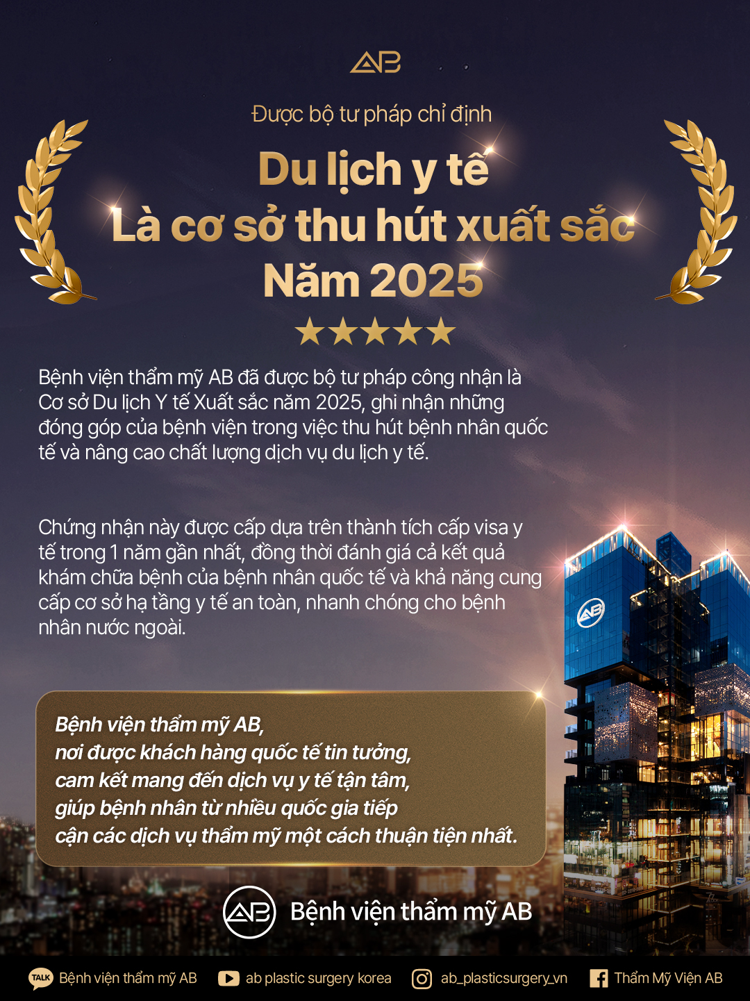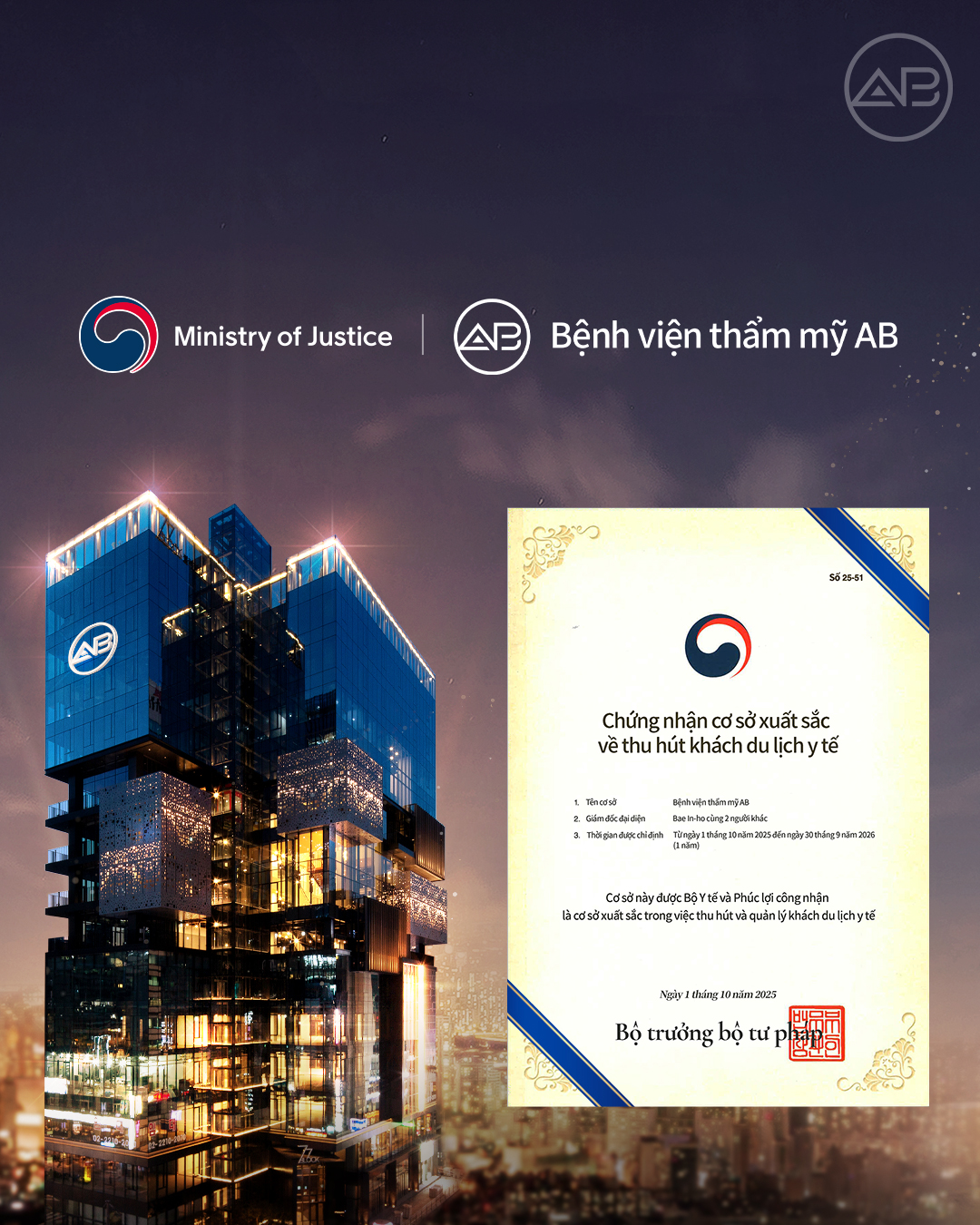🌟 Bệnh viện Thẩm mỹ AB tự hào được Bộ Y tế và phúc lợi công nhận là cơ sở xuất sắc trong thu hút khách du lịch y tế năm 2025 ✨