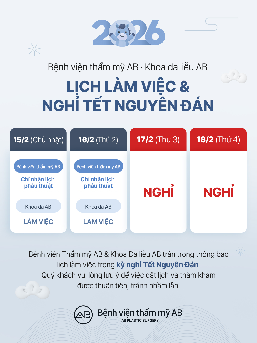 Bệnh viện Thẩm mỹ AB và Khoa Da liễu AB trân trọng thông báo đến Quý khách hàng lịch làm việc trong thời gian nghỉ Tết Nguyên Đán như sau:
