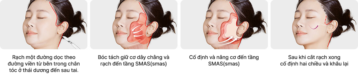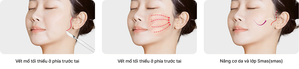 Phẫu thuật căng da mặt bao gồm rạch một đường dọc theo đường viền từ bên trong chân tóc ở thái dương đến sau tai. Kéo và cố định chắc chắn lớp cân mạc bị (SMAS) chảy xệ, cắt phần da thừa và tiến hành thực hiện khâu cố định kép lại, nâng cơ căng da mặt cải thiện tình trạng da bị chảy xệ của tổng gương mặt. Vì phạm vi vết mổ rộng hơn so với căng da mini nên trong quá trình tư vấn nhiều người lo lắng về sẹo và biến dạng tai (vết mổ ở tai). Bởi vì vết mổ được thực hiện từ thái dương dọc theo đường bên trong đường chân tóc nên không thấy vết sẹo ở ngoài, không chỉ cắt phần da mà vùng bóc tách dây chằng giữ cơ và lớp SMAS được cố định chắc chắn nên tai biến dạng ( vết mổ ở tai) và sẹo thì bạn không cần phải lo lắng. Ngay cả sau khi cải thiện bằng phương pháp phẫu thuật này, tôi nghĩ rằng bạn thường xuyên chăm sóc quản lý da thông qua các phương pháp điều trị như laser, tiêm filler, tiêm botox, bạn sẽ có thể duy trì gương mặt trở nên trẻ đẹp hơn.