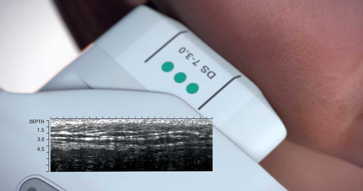 Bác sĩ sử dụng thiết bị Ultherapy chính hãng để truyền năng lượng siêu âm vào da ở các độ sâu: