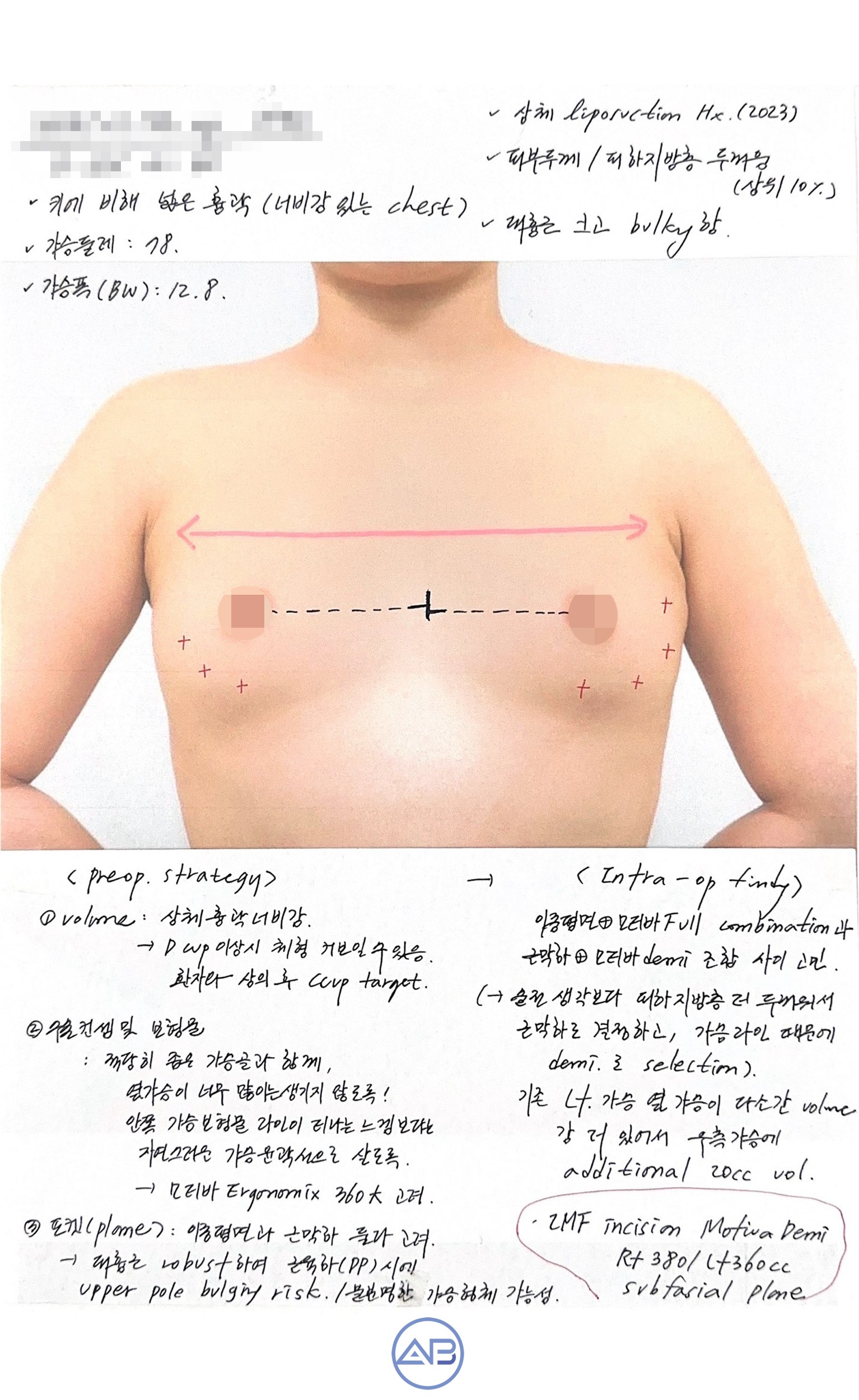 Vậy nên đặt túi độn như thế nào khi kích thước lồng ngực lớn như vậy? Túi độn có đường kính quá nhỏ so với kích thước lồng ngực cũng không tốt. Điều này là do khi đặt túi ngực nhỏ quá thì phần khe ngực bè ra và trông không tự nhiên. Vì vậy, mục tiêu đã đề ra của tôi là cúp ngực C khoảng 360cc. Không có sự khác biệt về quan điểm giữa hình ảnh cơ thể mà khách hàng mong muốn và hình ảnh tôi của tôi suy nghĩ. Vết mổ được thiết kế theo đường dưới chân ngực theo mong muốn của khách hàng.