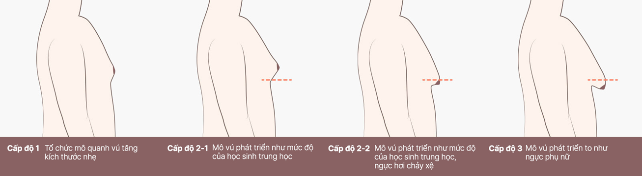 Ngoài ra, có những trường hợp phức tạp như vừa có mỡ vừa phát triển cả mô tuyến vú, vì vậy cần phải đến bệnh viện để kiểm tra và chẩn đoán kỹ lưỡng. Tiếp theo, trong trường hợp thực sự là ngực to do mô tuyến vú thì điều đó có nghĩa là mô tuyến vú phát triển quá đà và mỡ được phân phối dưới mô tuyến vú tạo ra tình trạng ngực như của phụ nữ. Để cải thiện chứng ngực to do phát triển mô tuyến vú này thì có các phương pháp phẫu thuật như loại bỏ mô tuyến vú phát triển quá mức và hút phần mỡ tích tụ. Như trong hình ảnh ở trên, độ nghiêm trọng của các triệu chứng ngực to ở nam giới được chia thành các mức độ khác nhau. Và khi khách hang ở mức độ 3 trở lên thì có thể được coi là chứng ngực to nghiêm trọng.