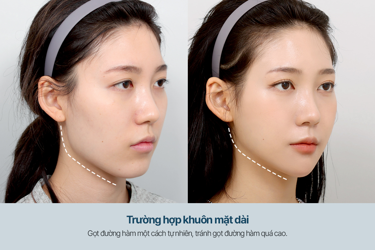 Với khuôn mặt dài, đặc điểm nổi bật là khuôn mặt trông dài về chiều dọc. Khi thực hiện, bác sĩ sẽ gọt hàm một cách tự nhiên, không nâng góc hàm quá cao, nhằm điều chỉnh chiều dài khuôn mặt một cách hợp lý. Phương pháp này giúp khuôn mặt trông cân đối hơn, tạo hình tổng thể hài hòa.